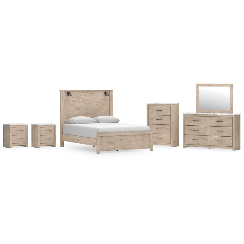 Cool, clean and casually modern. This bedroom packages light natural finish and faux Calcutta marble tops set the tone for your calming sanctuary. Large linear drawer pulls add dimension and authenticity, while the abstract headboard design brings a fresh