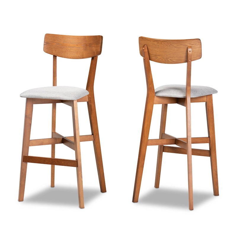 -Set includes two (2) bar stools -Constructed from rubberwood -Walnut brown finish -Upholstered in polyester fabric and padded with foam -Footrest -Assembly required -Dimensions: 44.5" High x 18.1" Wide x 20.1" Deep; Seating Dimensions: 30.3" High (from Fl