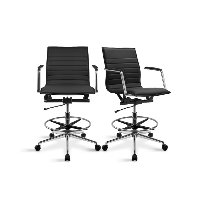 Set of 2 Drafting Chair Upholstered PU Leather Ribbed Mid Back Armchair – Contemporary – Office Chairs – by 2xhome-Loft_BlackX2