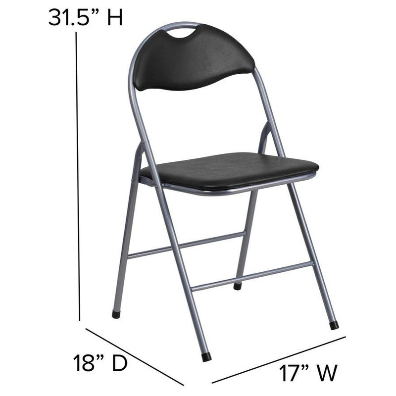 This is not your traditional metal folding chair this chair offers style with its open back design and modern appealing silver powder coated frame finish. Built for the commercial industry, these double braced metal chairs hold up to 300 lbs. This portable chair has a carrying handle to make transporting much easier when storing. No longer be unprepared when guests show up at your front door for an impromptu visit when you can pull these upholstered folding chairs from storage or closet. These chairs fold compactly with a depth of 1.75 they are ideal in homes and businesses where space is an issue. The vinyl upholstery is easy to clean after you’ve invited everyone over to feast. Minimize the foot traffic in your home by hosting an outdoor gathering while taking advantage of the good weather or so people don’t congregate inside your living room. Store these chairs indoors to protect the frames. These padded folding chairs come fully assembled to be of service upon delivery.