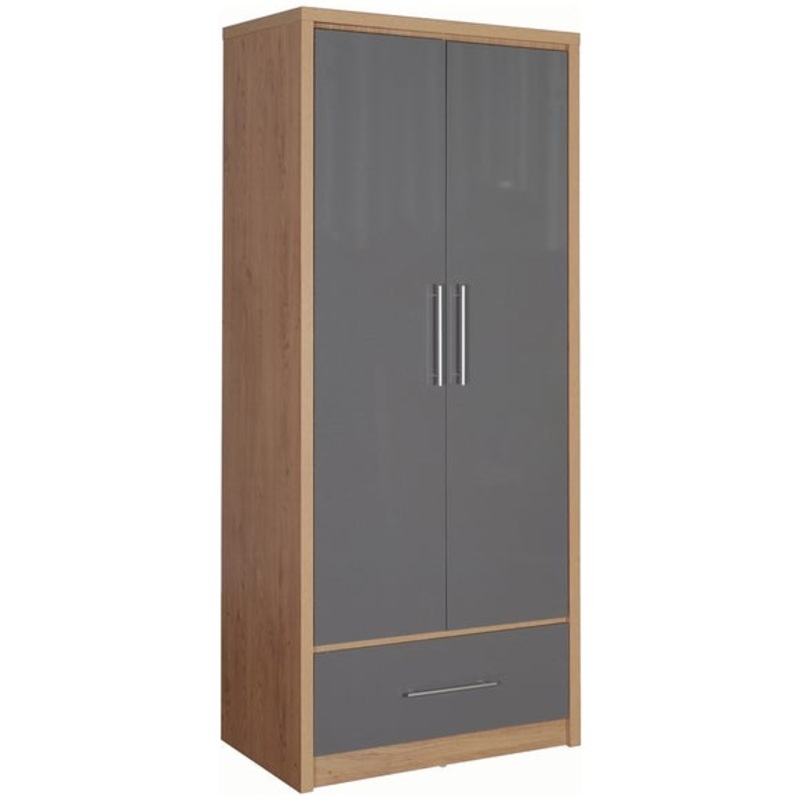 The bright Seville Double, 1 Drawer Wardrobe features a modern design owing to the gloss finished front which contrasts perfectly with the light oak veneers. The Seville has your storage needs covered thanks to the top shelf and hanging space from the meta