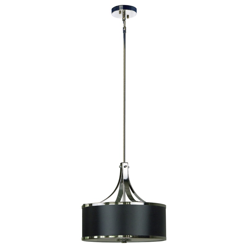 The Pauline Collection combines style and elegance to create a series of dramatic drum shade lights. The 3 light adjustable chandelier features a Chrome finish and a large, dramatic round 16 silk look Black Stealth fabric shade. A modern edge on a traditio