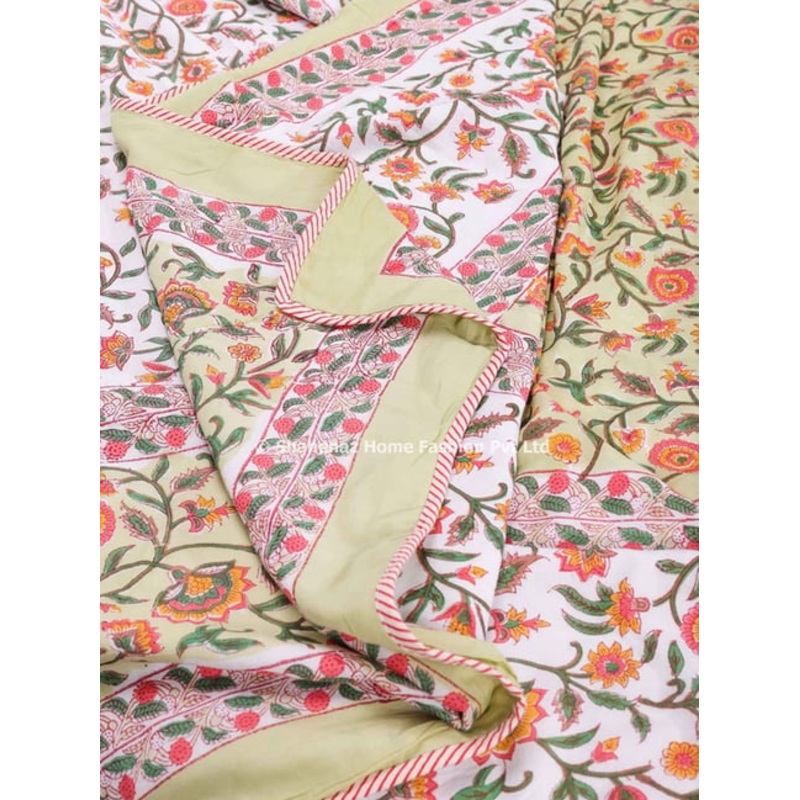 Unwind in a Floral Paradise: Chainika Flower Garden Dohar. Embrace comfort and style with the Chainika Flower Garden Dohar. Hand block-printed on the softest cotton muslin, this reversible dohar features a mesmerizing floral design in a calming green hue. Double the Delight, Reversible Design: The dohar reverses to a charming green, offering two unique looks to complement your mood or dcor. Lightweight Luxury,