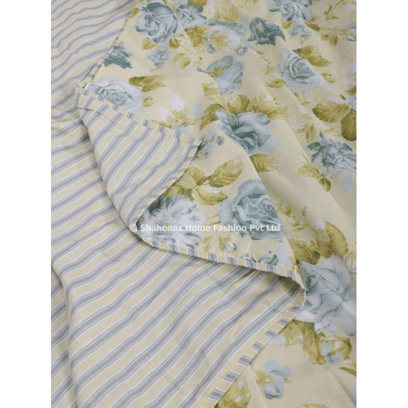 Drift Off in Romantic Comfort: Rose Print Dohar. Indulge in the delicate charm of the Rose Print Dohar. Handcrafted from 100 percent breathable cotton muslin, this luxuriously soft dohar features a captivating rose design in a calming pale yellow hue. Reversible for Double the Charm: This versatile dohar reverses to a beautiful print, offering two elegant looks to complement your mood or bedroom dcor.