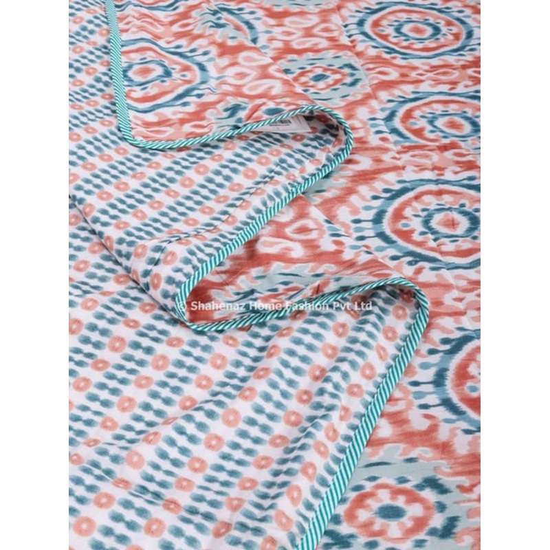 Sohi Peach Reversible Cotton Muslin Dohar with Ikkat Design. This dohar is made from 100 percent breathable cotton muslin, making it soft and lightweight. It features a delicate Sohi peach pattern with an Ikkat design, adding a touch of warmth and elegance to your bedroom dcor. Reversible Design for Double the Pleasure: One side showcases the charming peach Sohi pattern with an Ikkat design, creating a serene atmosphere perfect for relaxation. Flip the dohar to reveal a calming ikkat pattern, offering a versatile look to complement your mood or dcor.