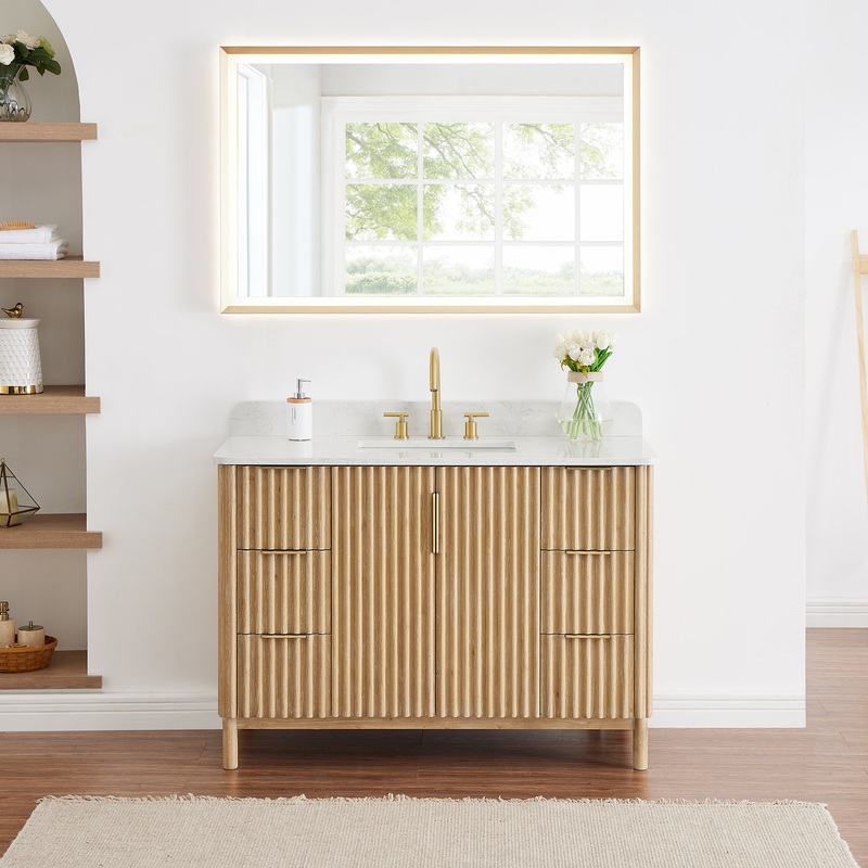 Balancing sophisticated accents with natural tones and textures, our elegant Sierra Series Bathroom Vanity is a striking style upgrade for your bathroom space. The captivating reeded design of the cabinet and door panels lends a unique, artisanal aesthetic