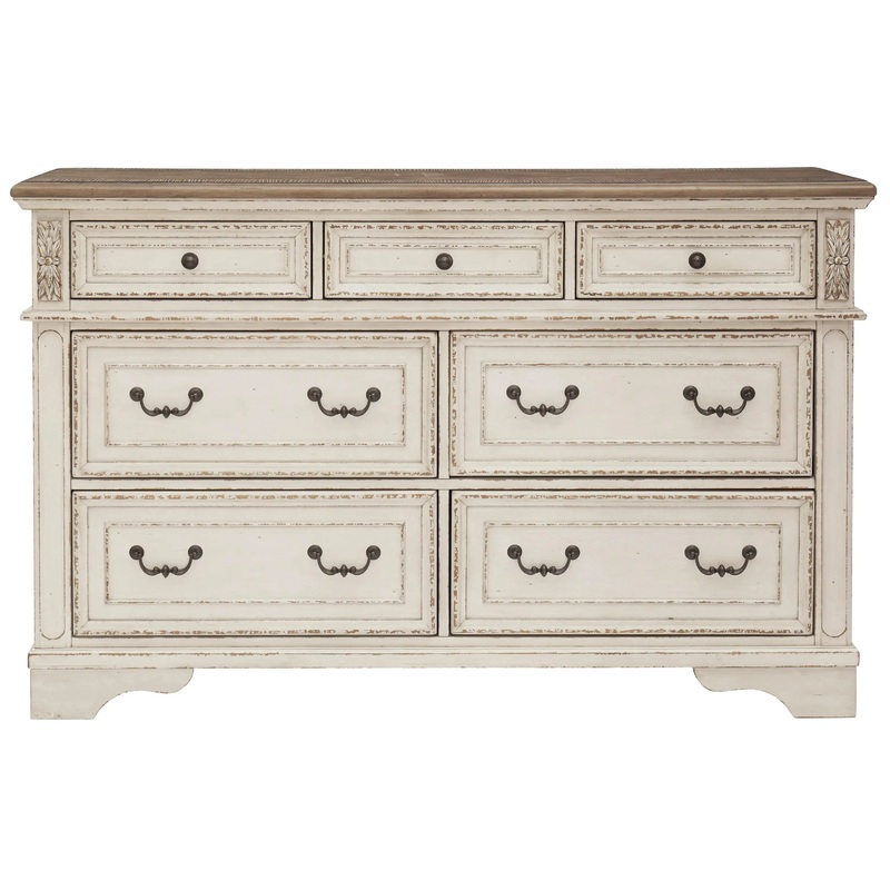 Elevating the art of traditional cottage styling, this dresser is your dream bedroom retreat realized. Its antiqued two-tone aesthetic blends a chipped white with a distressed wood finished top for added charm. Framed drawer fronts and decorative corbels add refinement, while bail pulls in a dark bronze-tone finish lend a classic touch.