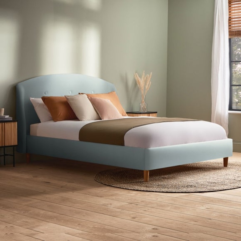 Handcrafted with precision here in the UK, this bedframe exudes sophistication and luxury with its premium upholstery fabric and meticulously crafted design. Featuring three tufted buttons and a tall, padded headboard for optimal comfort, it stands gracefully on wooden legs, adding a fresh allure to your sleeping space. Available in a range of stunning fabric choices, the Evana effortlessly harmonizes with your existing decor, creating a serene and inviting atmosphere. With adjustable side rails to accommodate various mattress depths and a sturdy wooden slatted base for exceptional support and airflow, the Evana ensures a restful night’s sleep.