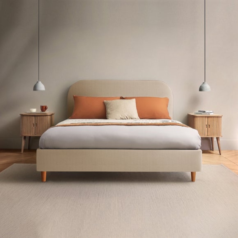 Upholstered HeadboardSlatted BaseLow Foot EndHandcrafted in the UK, this bed frame features a minimalistic design with a rounded padded headboard and wooden legs, offering both style and comfort. Upholstered in premium woven fabric, available in a range of
