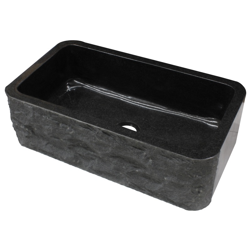 Simply stunning and built to last. This premier black granite kitchen sink handles any job in the kitchen all while being the center of attention. Three sides are polished while the front apron is chiseled to showcase raw granite texture and color. Outside dimensions measure 33-inches left to right by 18-inches front to back. The total height is 10-inches. The sidewalls are a solid 1.5-inches thick which gives an inside dimension of 30-inches by 15-inches and inside height of 8.5-inches. Keep in mind this sink is beautifully crafted by our master artisans so dimensions may vary up to a quarter inch. Colors and variations may also vary a little since it is natural stone, but this black granite is very consistent. This sink is made with a standard 3.5-inch drain opening and is compatible with disposals. Be sure to reinforce this sink when installing as it weighs 270 pounds!