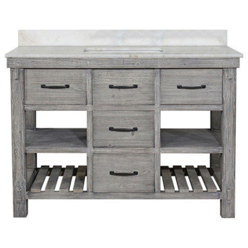 Introduce some old-fashioned charm to your bathroom withThis single-sink vanity. The base is made of recycled fir with a fashionably Grey-Driftwood finish for a quaint look, and the marble topAdds a touch of sophistication. One tip-out drawer, four spacious pull-out drawer, and four exposed shelf let youOrganize all your essentials.