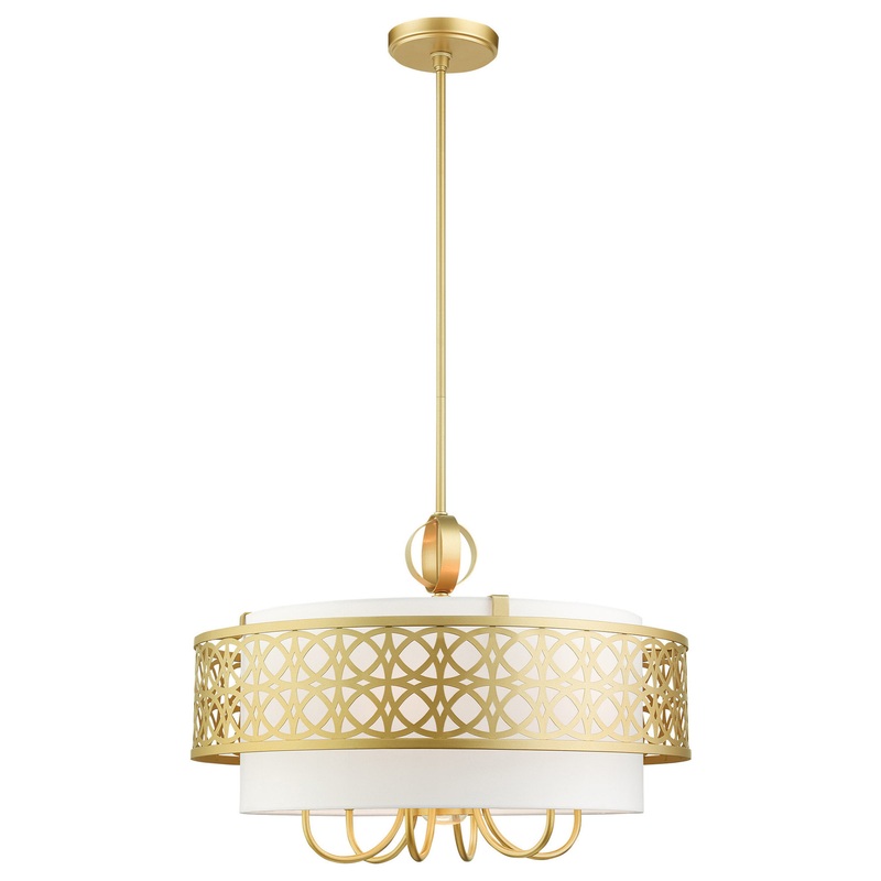 The transitional Calinda series adds refined style and a hint of mystery to your dcor. The soft gold finish and an off-white handcrafted hardback shade create warm illumination, while soft light brings to life the intricate fretwork pattern. This seven-light pendant chandelierwill add a sophisticated and glamorous look to almost any interior design style. A ball decoration on top gives the fixture a regal essence, and the complementing exposed arms at the bottom with additional downlight add a touch of style. It will work great in a living room, dining room, kitchen or bedroom setting.