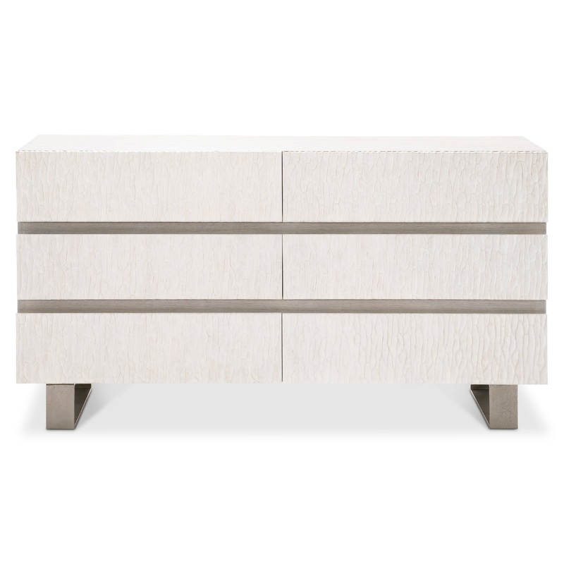 Understated contrasts are woven together in the Solaria dresser. Sunwashed wood, chiseled cast resin and textural metal mix together for a stunning alchemy of design. Six drawers offer essential storage for the bedroom.