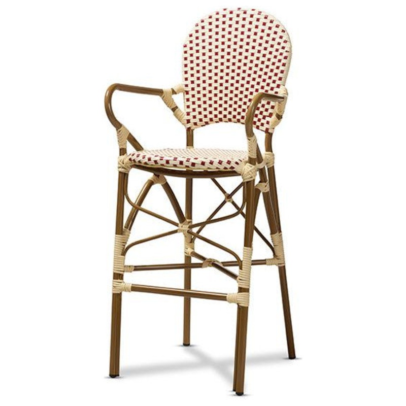 Bring the charm of the classic French bistro to your home with the Marguerite bar stool. Constructed from aluminum and coated in powder, the Marguerite features a high backrest that provides the support you need to sit comfortably at the counter. This stackable bar stool is designed for everyday use and is superbly suited for a deck, balcony or indoor space. Featuring a bamboo style frame with multi-color accents, the Marguerite is easy to coordinate with a wide range of decorative styles. The Marguerite bar stool is made in China and will arrive fully assembled.