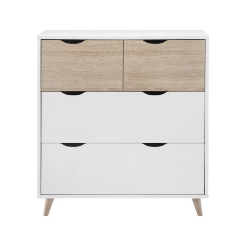 Matt white finishOak legs and smaller drawersIntegral handlesFits into any roomScandinavian styleThe Stockholm 4 Drawer Chest showcases a matt white finish with oak legs and integral handles. Its Scandinavian style fits effortlessly into any room. The smal