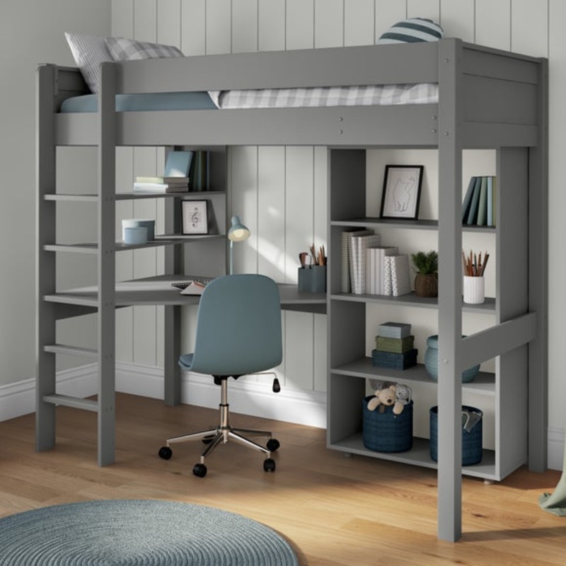 Painted pine frameHigh foot endSlatted baseSpace savingAssembled on deliveryCan only be delivered to mainland UKThis high sleeper not only offers a comfortable elevated sleeping area but also includes a functional desk, shelving unit, and a tall bookcase,