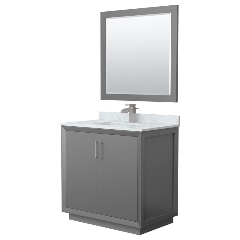 -Countertop with porcelain undermount square sink is drilled for single-hole faucet mount. Faucet(s) not included. Matching 34″ mirror