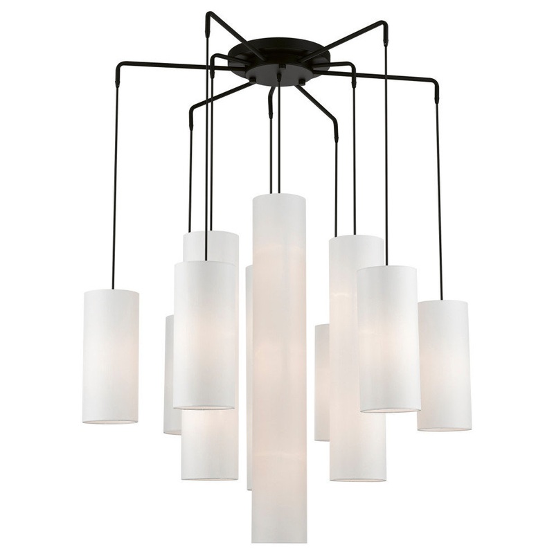 The Strathmore contemporary foyer chandelier pairs a black finish with off-white fabric hardback shades arranged in an alternating tiered pattern for an eye catching array, perfect for spaces incorporating modern, rustic, and contemporary themes. -Bulb Wat