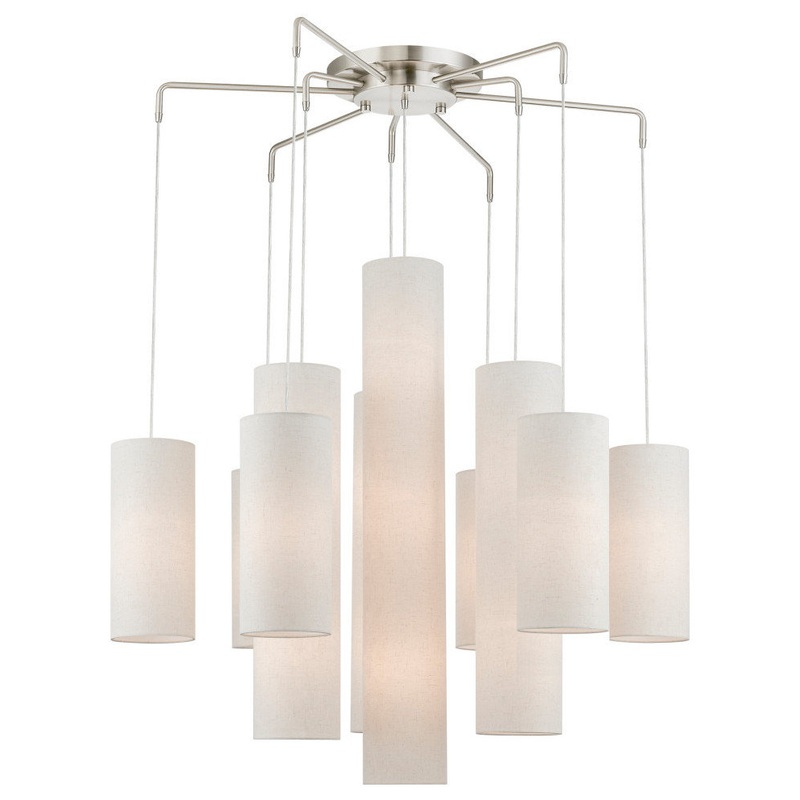 The Strathmore contemporary foyer chandelier pairs a brushed nickel finish with oatmeal fabric hardback shades arranged in an alternating tiered pattern for an eye catching array, perfect for spaces incorporating modern, rustic, and contemporary themes.