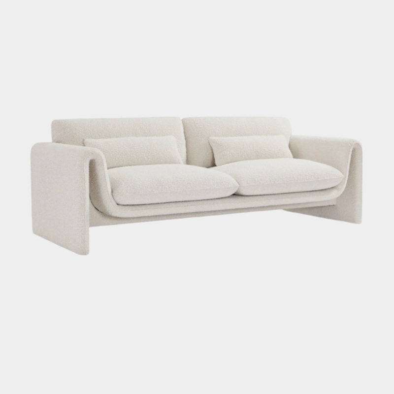 Dimensions:86″ W x 38″ D x 31″ HWeight:186.8 lb.Color:Cream Boucle FabricStyle:ContemporaryMaterial:Boucle Fabric, Engineered Wood, FoamCollection:StylusPillows:IncludedSeat Width:70″Seat Height:19″Seat Depth:24″Arm Height:25″Back Height:12″Fabric Composition:100% PolyesterOverall Width:86″Overall Depth:38″Overall Height:31″Total Weight:186.8 lb.Item Type:Sofa