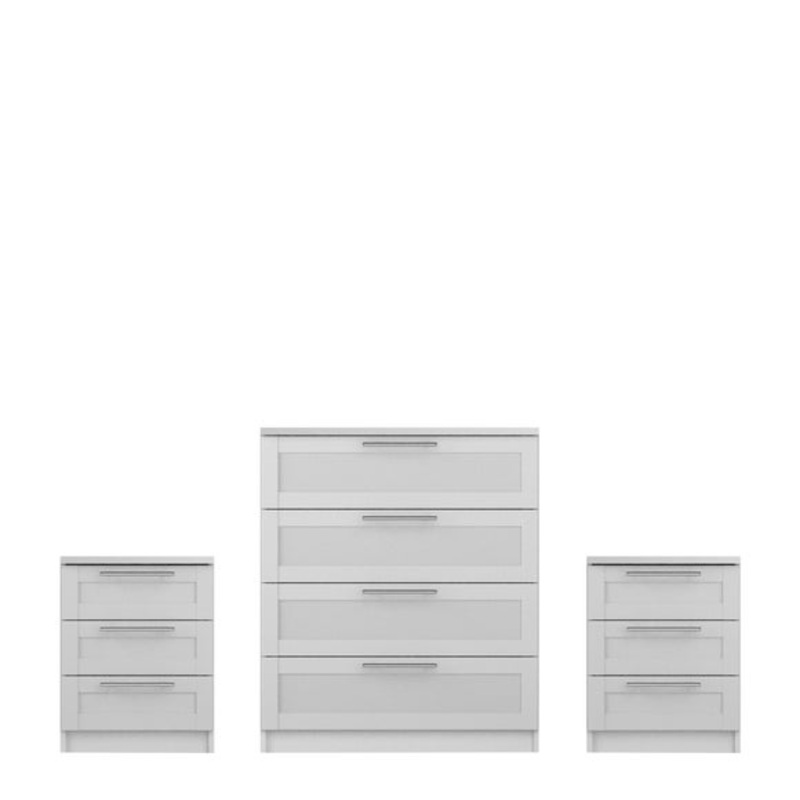 Set includes: 2 x Bedside Table, 1 x Chest of drawersSilver effect handlesShaker Framed FrontsSet offers ample storage spaceThe Sudbury Framed 3 Piece Bedroom Furniture Set offers large storage drawers, an 18mm top panel, and metal drawer runners for a sty