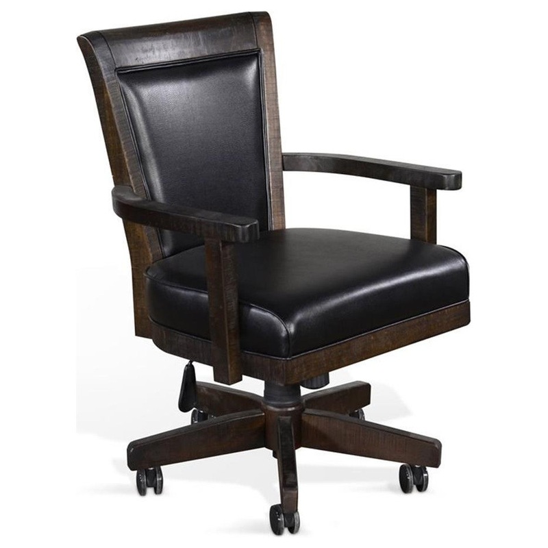 The Homestead Collection is crafted with mahogany solids and veneers. The rough sawn distressing is complemented by a gorgeous Tobacco Leaf finish. Features: -Materials: Wood -Finish: Tobacco leaf -Mahogany solids and veneers -Tilt swivel caster arm chair
