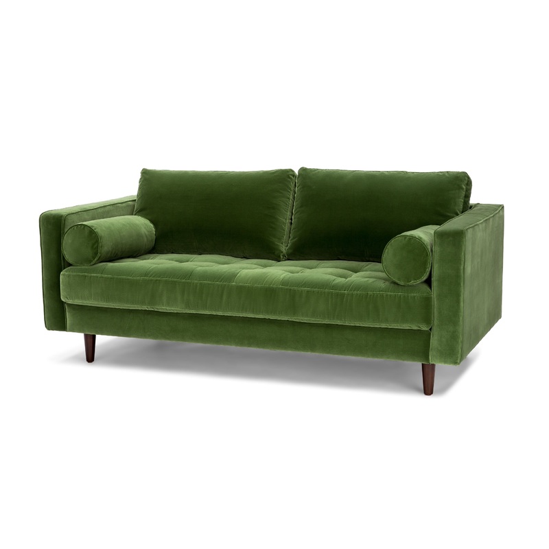 DescriptionGarden party, but in your apartment. The Sven in grass green velvet is what Anne of Green Gables would have put in her urban laneway house. A corner blocked frame keeps this green velvet loveseat sturdy, and loose bolsters and back cushions make it easy to clean. Stay for a cuppa (or maybe something stronger).FeaturesSturdy corner blocked wooden frameHigh density foam with polyester fillingCotton Velvet upholsteryPirelli webbingLoose seat and back cushionsLoose bolsters includedSimple assembly required (approximately 5 minutes)