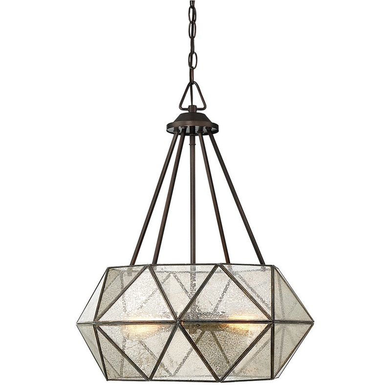 Triangles create drama, and this pendant is no exception! Multiple triangular panes have been fitted together, creating a ring-like form around the central column. Several supporting downrods link the canopy to the frame, forming more triangles. The frame has a sumptuous, oiled burnished bronze finish that showcases the bold geometric lines of the pendant. And the triangular panes are made of lovely, mercury glass providing even more visual and textural interest. Four 60W, E-style bulbs shine through the mercury glass to illuminate your room. The pendant measures 20 wide and 25.5 high: an excellent size for dynamic high style in your home.