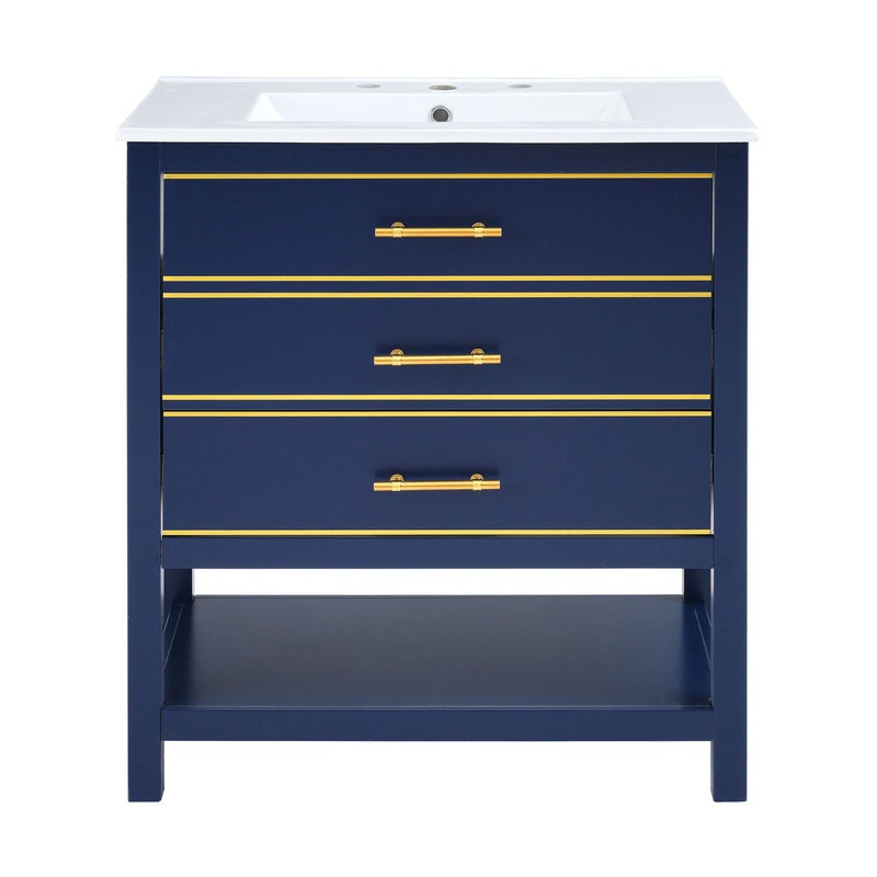 -Modern 30inch White Bathroom Vanity with Open Storage, Two DrawersUpgrade your bathroom with our Solid Wood Frame + MDF White Bathroom Vanity Cabinet. Combining classic aesthetics with modern design elements, this cabinet provides both style and durability. The U-shaped drawers, gold accents, and open storage space make it a functional and elegant addition to any bathroom. Assemble with confidence using our detailed instructions included. Transform your space today!