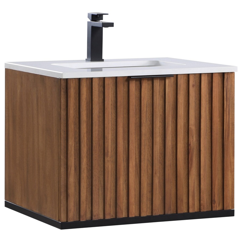 Terra's uniquely fluted design facade in Walnut or Cashmere Grey veneer adds a sleek and bold look to any bathroom. The architectural metal frame is carefully fashioned in Satin Brass, Matte Black, or Brushed Nickel. Floor models feature a handsome, durabl