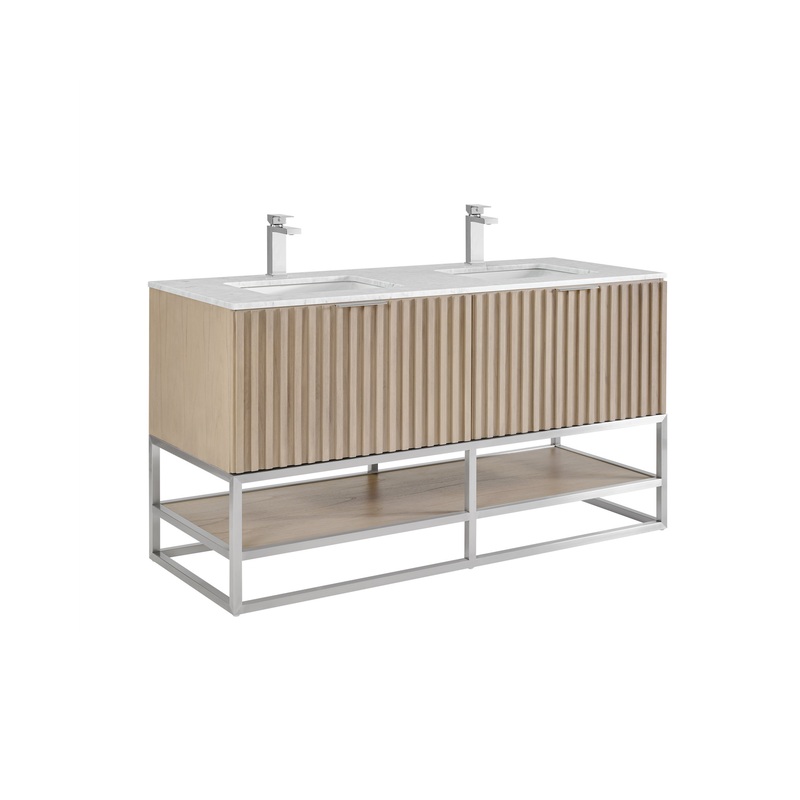 Terra’s uniquely fluted design facade in Walnut or Cashmere Grey veneer will add a sleek and bold look to any bathroom. The architectural metal frame is carefully fashioned in Satin Brass, Matte Black, or Brushed Nickel. Floor models are designed with a handsome, durable and functional integrated storage shelf. The vanity’s deep soft-close and interior pullout drawers are complimented with a matching finish allowing for an easy-to-clean environment. Premium Blum glides deliver an effortless motion while the dovetailed joints provide seamless joinery. Choose between a smooth Italian Carrara marble or a Pure White Quartz top to complete the unified look. (Faucet not included)