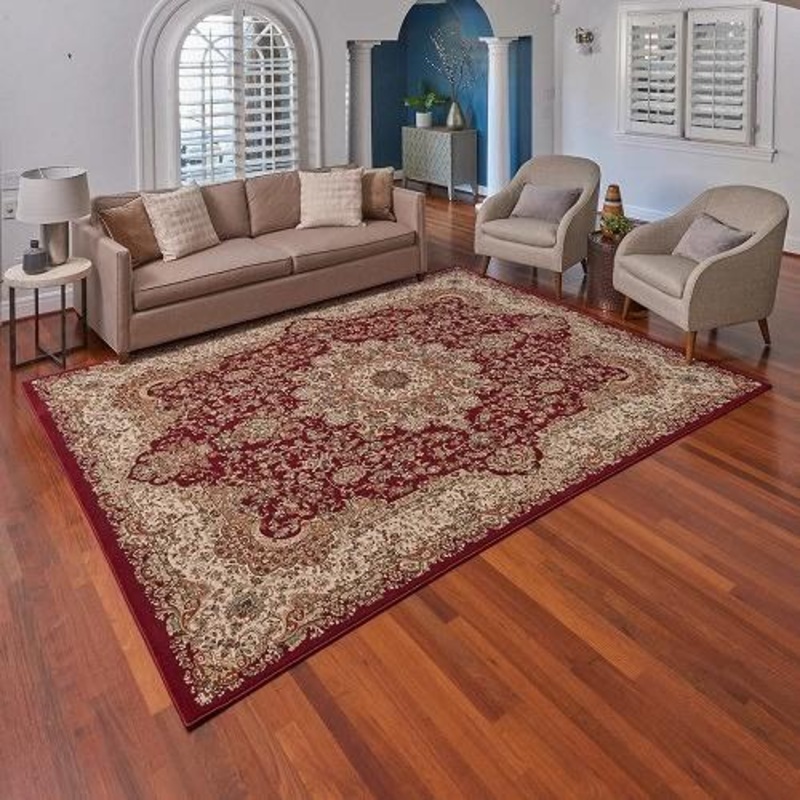 • Colors: Selby Black: A dramatic traditional medallion pattern featuring a black background and warm accent colors including light golds, soft beiges, reds, and a touch of green. Selby Red: A dramatic traditional medallion pattern featuring soft burnt gold, warm ivory and dark olive highlight the warm burgundy with accents of black