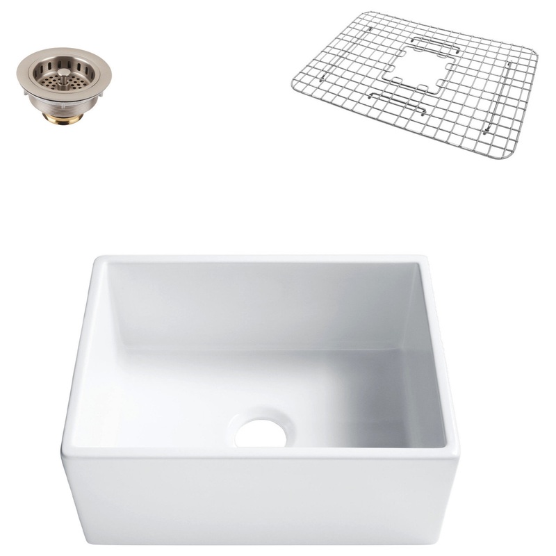 Thompson Traders KSA-494FC Features: Covered under Thompson Traders’ limited lifetime warranty Constructed from Fireclay Farmhouse installation sink will require special cabinets with an exposed front Single basin design for maximum work space Center drain location provides optimal draining capability Basket strainer included Basin rack included Coordinates with products from the Fireclay line Thompson Traders KSA-494FC Specifications: Sink Length: 24″ (left to right) Sink Width: 18 (front to back) Sink Height: 10″ (bottom to top) Basin Dimensions: 22″ L x 16″ W x 9″ D Minimum Cabinet Size: 30″ Drain Connection: 3-1/2″
