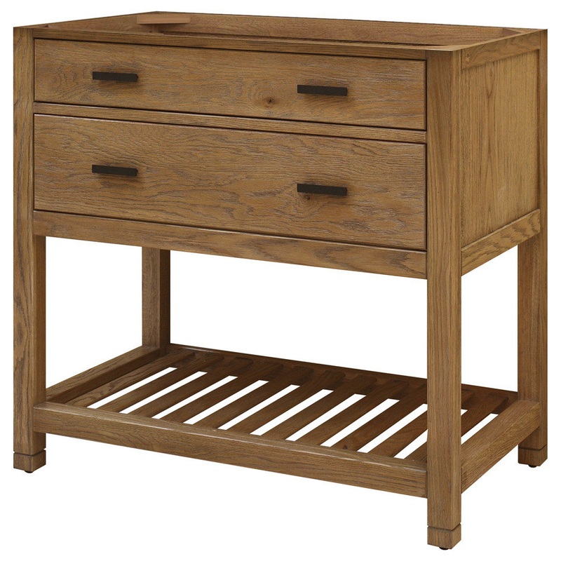 With its clean lines, warm finish and simple, metal hardware, the Toby Vanity is perfectly suited for your coastal or contemporary bathroom. It’s equipped with a pair of sizable drawers to cache toiletries, cleaning supplies and other bathroom essentials, and a lower slatted shelf that can be used to hold linens and bath tissue. Top it with a countertop of your liking to complete the look.