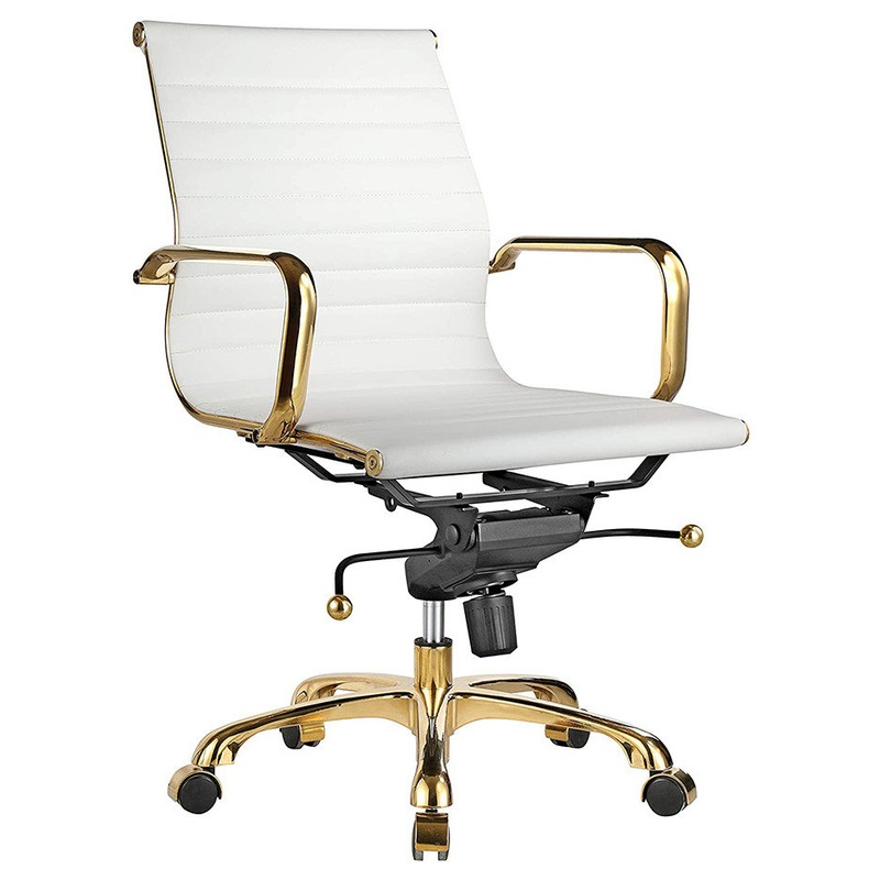 Elegant and comfortable Low back office chair Perfect for a stylish office or work space, with PU leather upholstery and metal gold frame, polished finish. -360 degree Swivel -Fixed Arms -Tilt Mechanism -5 Casters -Dimensions37.25"-35"H (SH 19.75"-17.5") x