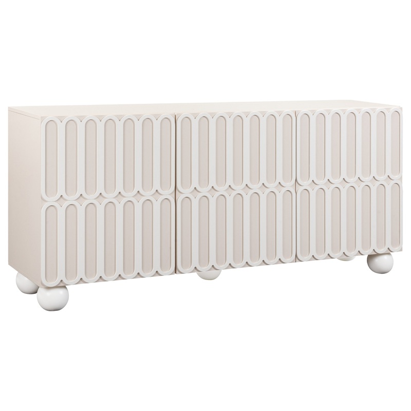 Steal the spotlight with the Tori Motif Taupe Buffet, where a dynamic facade plays the lead role without overshadowing its practical brilliance. Behind the scenes, four discreet drawers offer a storage ensemble fit for the most discerning collector, all perched upon solid wood, spherical legs that bring a sculptural, Hollywood-esque flair. This buffet dazzles with a medium sheen that makes cleanup a breeze, paired with soft-close hinges that salute quality, and adjustable shelves that flex to fit your function with a dash of finesse.