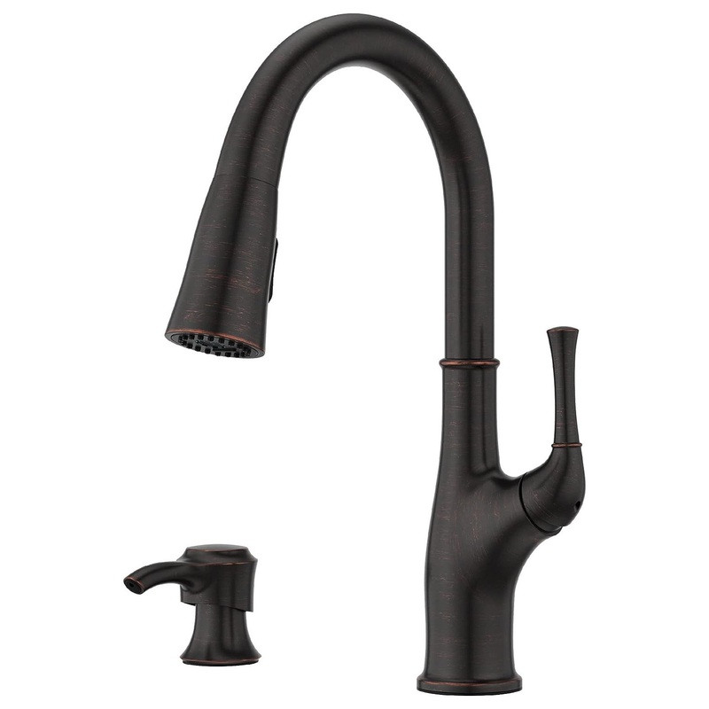 -KITCHEN FAUCET WITH PULL DOWN SPRAYER Advanced spray head docking system; elegant forward handle design underscores ergonomic function and helps where space behind the faucet is limited; includes coordinating soap dispenser and decorative deckplate