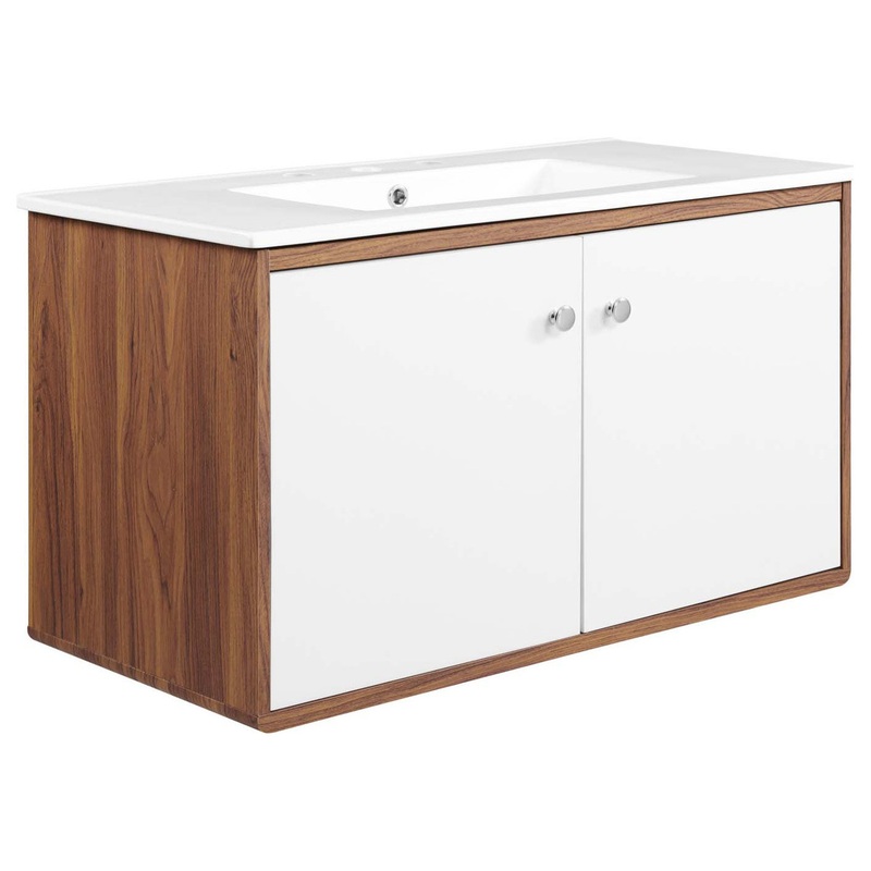 Bring mid-century modern aesthetics into the bathroom with the Transmit 36″ Bathroom Vanity. This vanity features a durable particleboard and walnut grain veneer construction with ample storage space for all your bathroom essentials behind two white lacquered soft-close hinged doors. A ceramic sink with an integrated countertop, 8″ centerset, and rectangular sink basin continue the sleek look of this retro modern vanity. Complete with chrome knobs, this bathroom vanity mounts directly to the wall saving a substantial amount of floor space. Assembly required and sink fixtures not included.