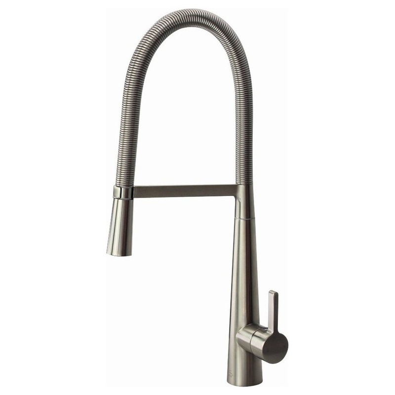 Solid brass construction. Single lever handle. Single function pull-down spray. Durable, flexible steel spring high arc spout for easy use and quick release support arm. Ceramic disk cartridge. 1.8 GPM flow rate (6.8L/min) - saves 20% more water. Flexible