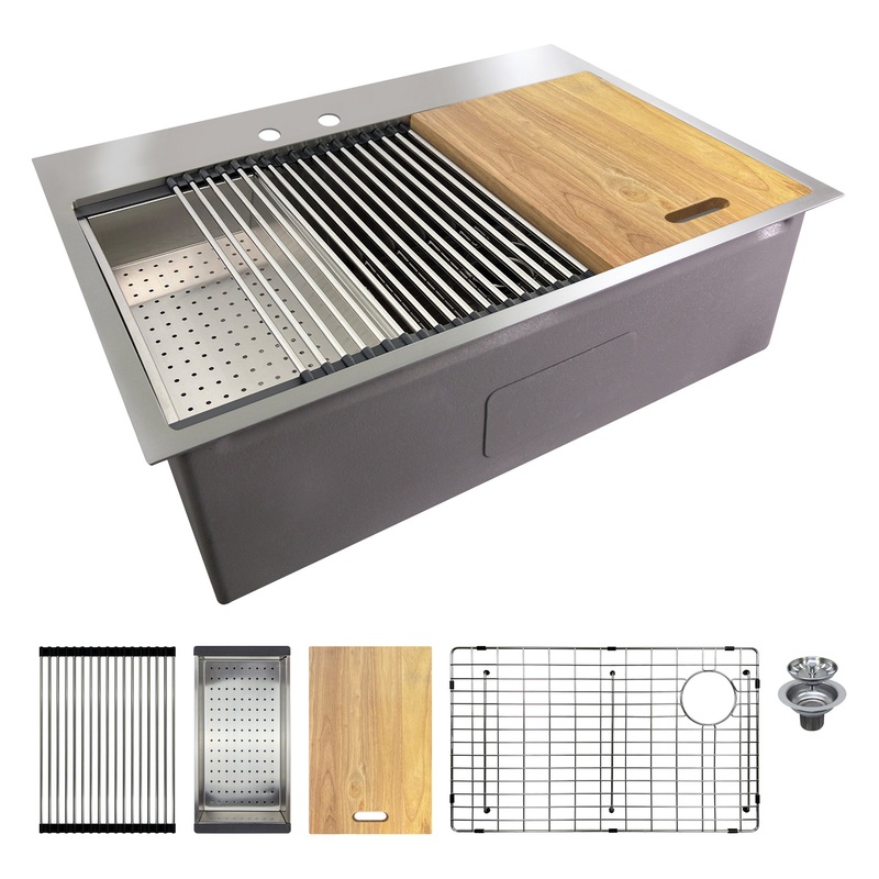 -KIT INCLUDES: 30-in x 22-in x 10-in drop-in sink with two (ML2) pre-drilled faucet holes, stainless steel bottom sink grid, stainless steel colander, stainless steel roller mat, wood cutting board, and stainless steel standard sink strainer