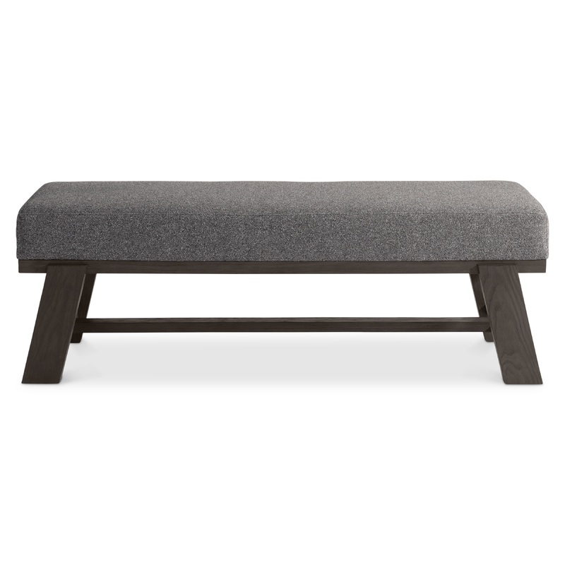 • Bench with upholstered seat with wood frame with exposed seat rail all around, legs and stretcher.