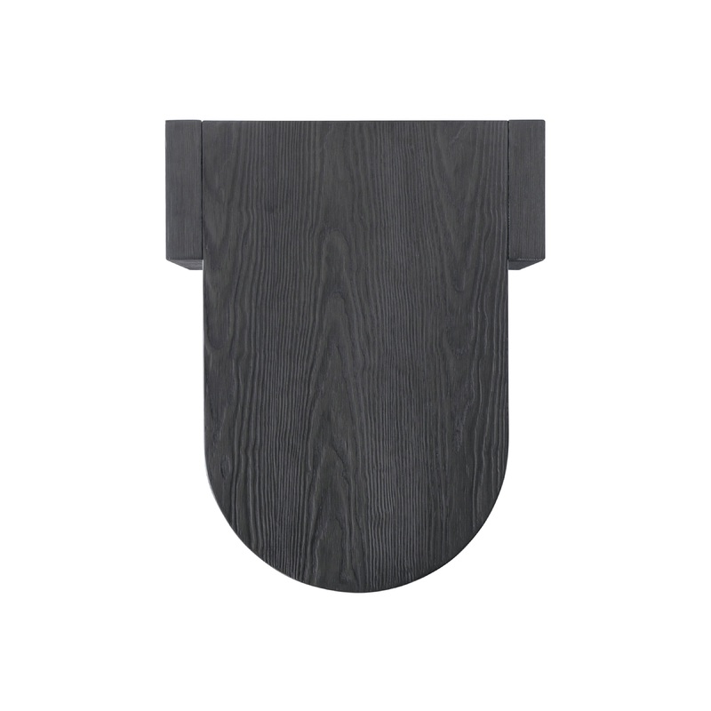 L'Ombre finish on pine side table.One end of top and base rounded and supported by round post.Fixed shelf surface at the base between the post and back panel of the table.Adjustable glides.An elevated design aesthetic explores the elemental relationship be