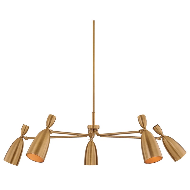The Spade family offers a modern take on the Italian Stilnovo style. A classic tapered cone profile is softened to a pointed dome to create a modern, functional shade. Captured by a pivot, it can be directed to allow customized spot lighting wherever needed. The refined Patina Brass metalwork adds an antique note to the fixtures. Spade is available as a 1-light sconce or 5-light chandelier.