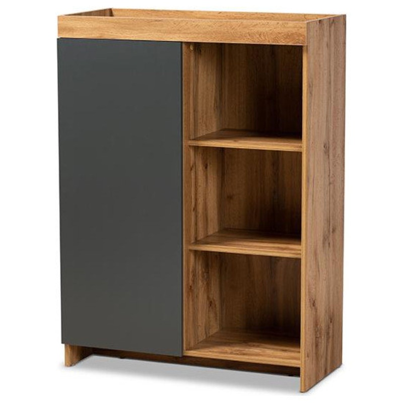 Create an eye catching display in your entryway with the stunning Caspian shoe cabinet. Made in Malaysia, the Caspian is constructed from sturdy wood showcasing a two-tone grey and oak brown finish for a cool, modern look. Three open shelves and three additional shelves behind the door are capable of supporting around 12 pairs of shoes, depending on size. Requiring assembly, the Caspian features an inset tabletop that provides a protective barrier for decorative items. An excellent blend of utility and style, the Caspian shoe cabinet upgrades any space.