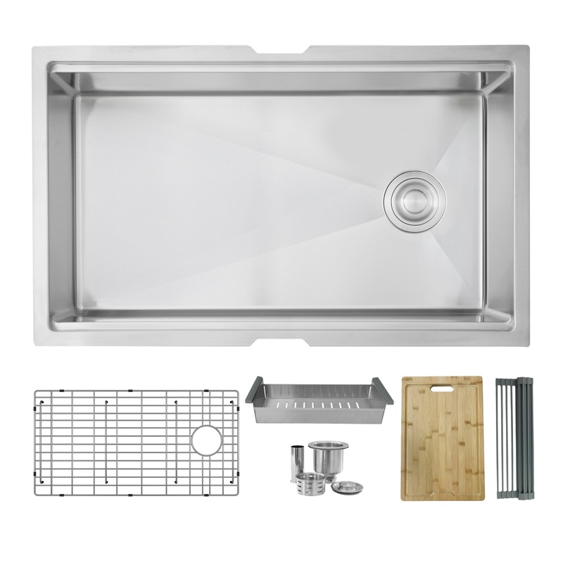 Upgrade your modern kitchen with this 16-gauge stainless steel kitchen workstation sink. This single-bowl undermount workstation sink combines a sleek, durable design with built-in accessories that slide effortlessly on the integrated ledge, maximizing wor