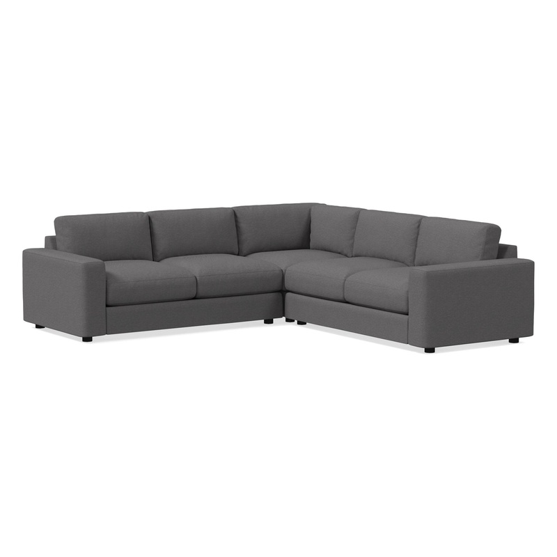 Choose your sectional size: 106″ or 116″.Hand-built frames with hand-finished upholstery.Solid oak and engineered hardwood frame with reinforced joinery.All wood is kiln-dried to prevent warping.High-gauge sinuous springs provide cushion support.Seat cushions have fiber-wrapped, high-resiliency polyurethane foam cores.Seat firmness: Soft. On a scale from 1 to 5 (5 being firmest), we rate it a 2.Back cushions come in your choice of 100% poly fill or down & feather blend wrap.Reversible cushions with zip-off covers.Concealed support legs (removable) for a streamlined profile.Sectional pieces attach via alligator clips (included).Assembled in the USA.