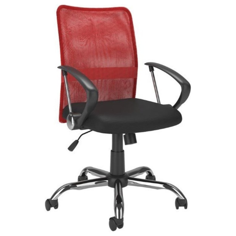 Style your office desk with the red mesh fabric back office chair from UrbanPro. Featuring a fabric seat, contoured mesh back with lumbar support, gas lift, chrome base, and rolling wheels. The comfortable, contemporary design will accent any desk setting while offering the option to adjust to your desk height and body shape with ease. A great addition to any office.