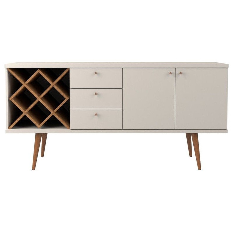 Built for the entertainer and designed for the wine lover, the Utopia Sideboard is the perfect blend of quality craftsmanship, style, and modern functionality. Featuring ample storage with three extending drawers and two concealed shelves, the sideboard also includes four spots to hold your favorite bottles of wine in between celebrations. Copper metal round door handles add subtle glamour and sophistication to this bold statement piece. Available in off-white and maple cream and white gloss and maple cream. Dimensions: 63.38 in. Length, 30.31 in. Height, 17.32 in. Depth Ships: FedEx