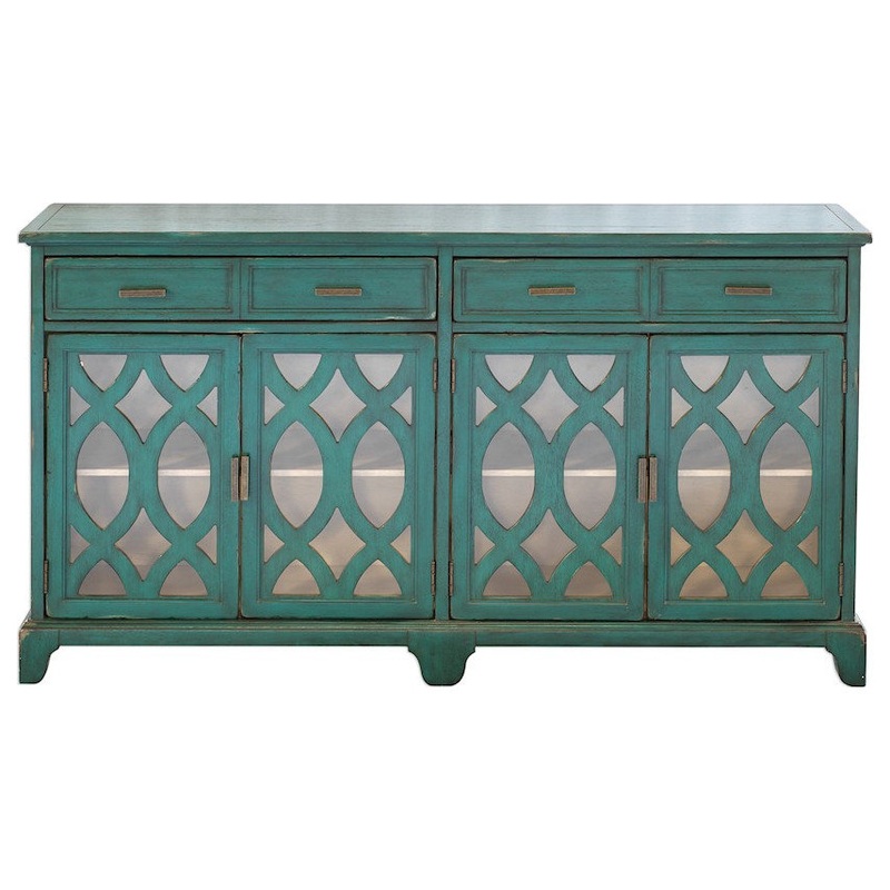 Featuring Solid Wood Construction, This Credenza Showcases Enhanced Cabinet Doors With Intricate Wooden Cutouts Over Glass. Finished In An Antique Green Exterior With A Contrasting Antique White Finished Interior, And Accented With Coffee Bronze Finished Hardware. Open Shelf Styling Allows Versatility As A Sideboard Or Media Console. Interior Shelves Are Adjustable.