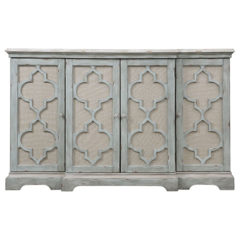 Breakfront Console In Weathered Sea Gray With Ivory Accents. Open-carved Doors Are Backed In Light Tan Linen, Enclosing Three Adjustable Shelves. Uttermost Accent Furniture Combines Premium Quality Materials With Unique High-style Design. With The Advanced